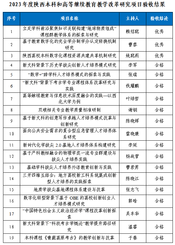 近日,陕西省教育厅公布了2023年度陕西本科和高等继续教育教学改革研究项目结题验收结果,我校《立足学科前沿聚焦知识关联构建“地球物质组成”课程群教学体系的探索与研究》等19个项目全部通过结题验收,其中结题优秀项目3项。