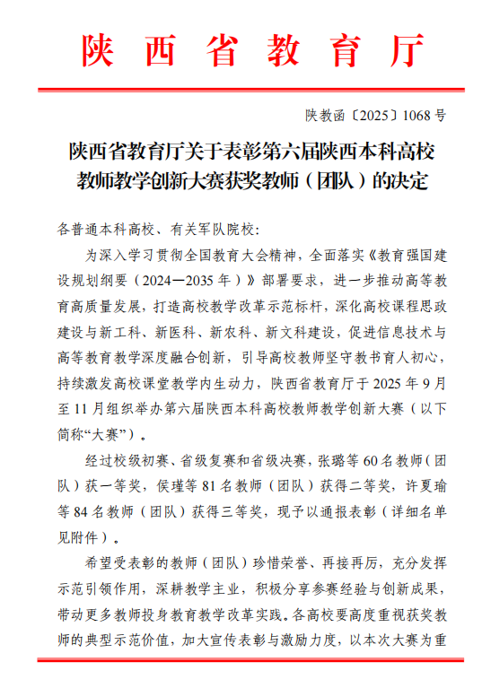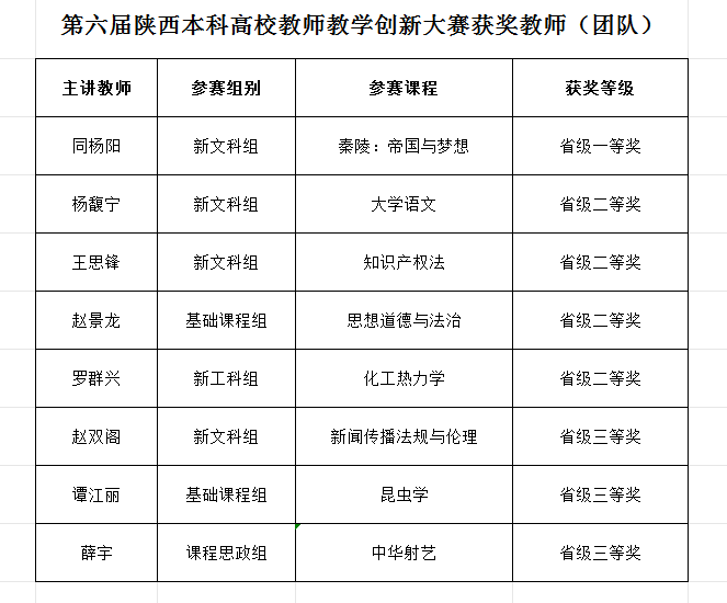 近日,陕西省教育厅公布了第六届陕西本科高校教师教学创新大赛获奖名单,我校文化遗产学院同杨阳教师团队获省级一等奖,文学院杨馥宁教师团队、法学院王思锋教师团队、马克思主义学院赵景龙教师团队和化工学院罗群兴教师团队获省级二等奖,新闻传播学院赵双阁教师团队、生命科学学院谭江丽教师团队和体育教研部薛宇教师团队获省级三等奖。
